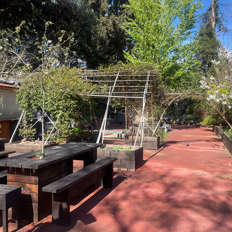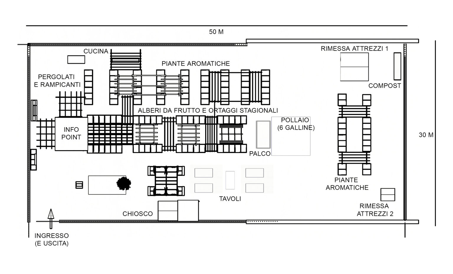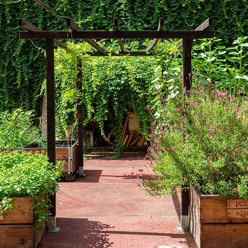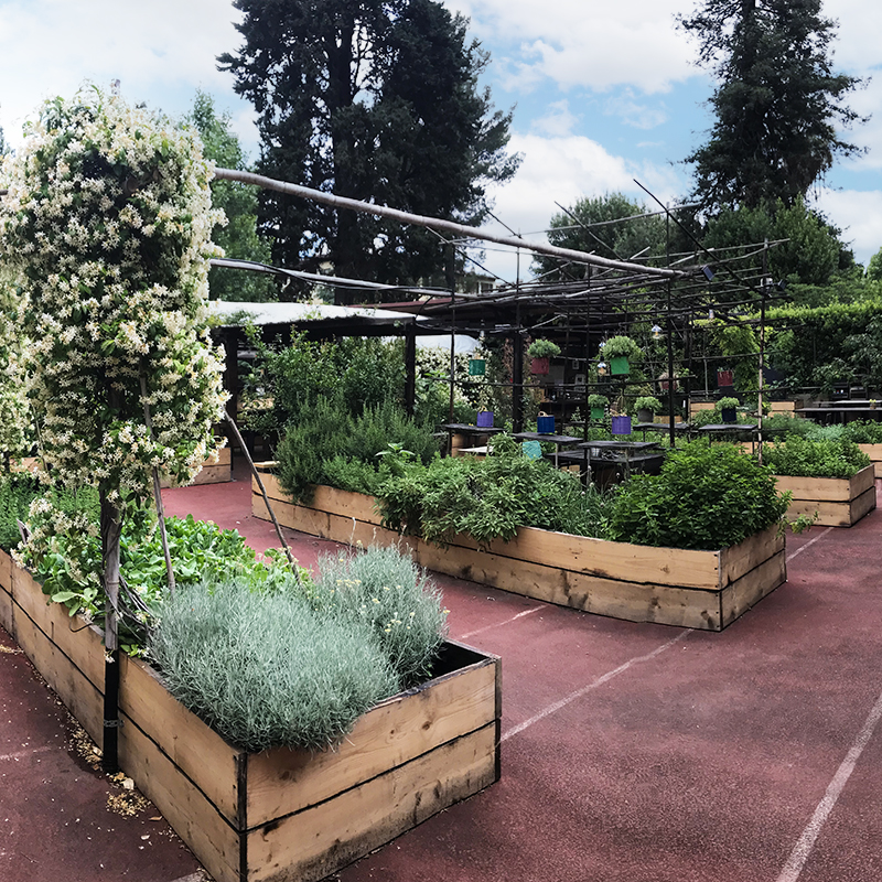 La modularità spaziale è ulteriormente esaltata dall’uso di contenitori mobili per la semina e aiuole rialzate, che non solo facilitano l’ergonomia del lavoro agricolo per i volontari e i soggetti con disabilità, ma fungono anche da quinte sceniche modulari che possono essere riposizionate per creare aree riservate o spazi aperti a seconda delle necessità di un evento privato o aziendale.